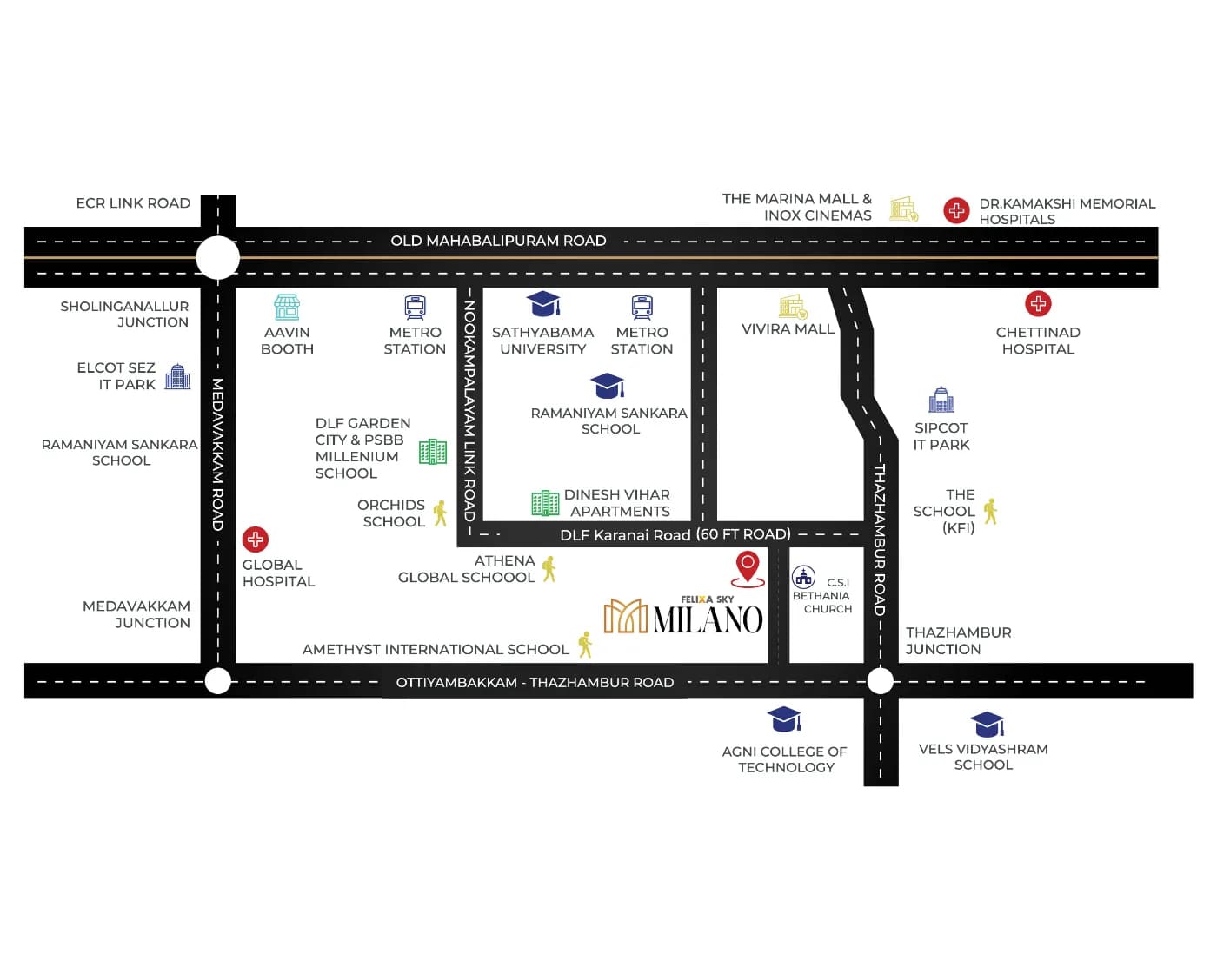Strategically located near Navalur, with fast access to OMR, Sholinganallur, Medavakkam, Perumbakkam, Siruseri IT Park, Semmencheri, Karanai & Thazhambur